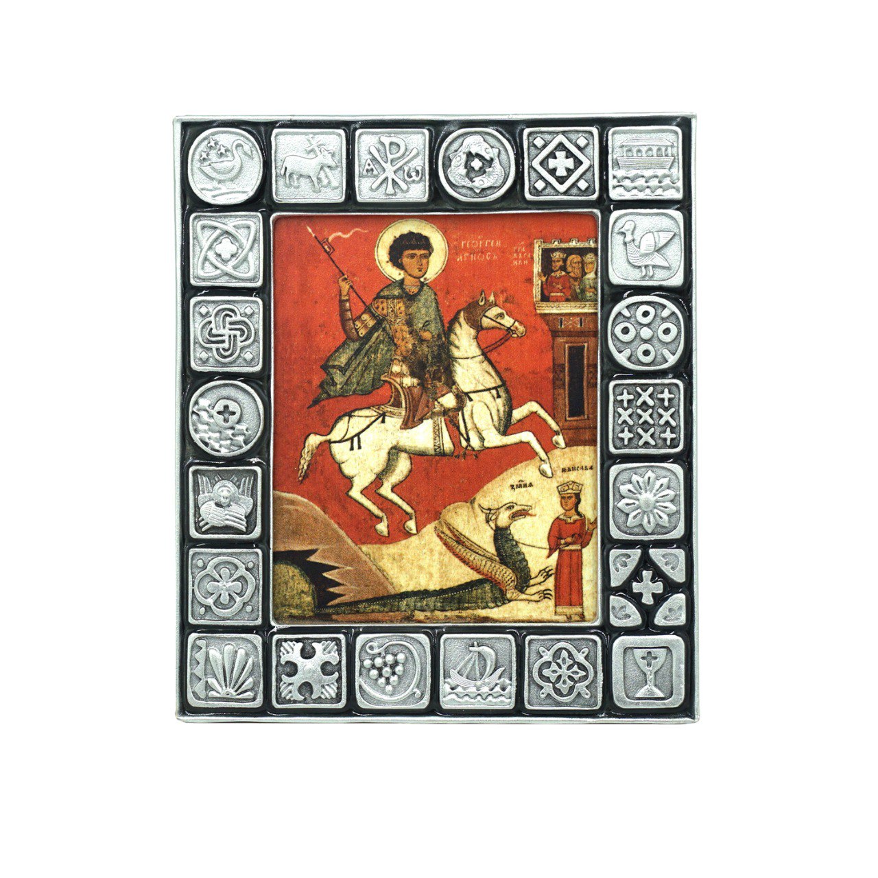 Икона святого Георгия обрамлена клеймами с уникальными изображениями. Цветок, ковчег, плывущий по волнам, рыбки, агнец, райские птицы, виноградная лоза, кораблик, Чаша, украшенные Кресты, Хризма, агнец, шестикрылый Серафим. Все эти образы говорят о чудесах Божиих, наполняющих нашу жизнь, о Рае, бесконечной красоте мира, о постоянном присутствии Бога рядом с нами и о Вечной жизни, к которой мы неотступно стремимся. И о любви, конечно.