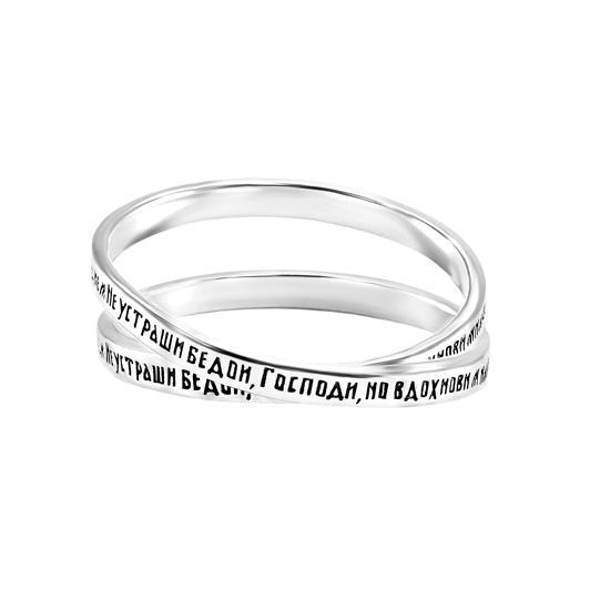 Прекрасное изящное колечко из серебра. То ли два кольца едва касаются друг друга, то ли вьется по руке тонкая лента. Из этой формы извлекается драгоценный смысл: бесконечность молитвы, слова которой написаны и звучат непрерывно.
