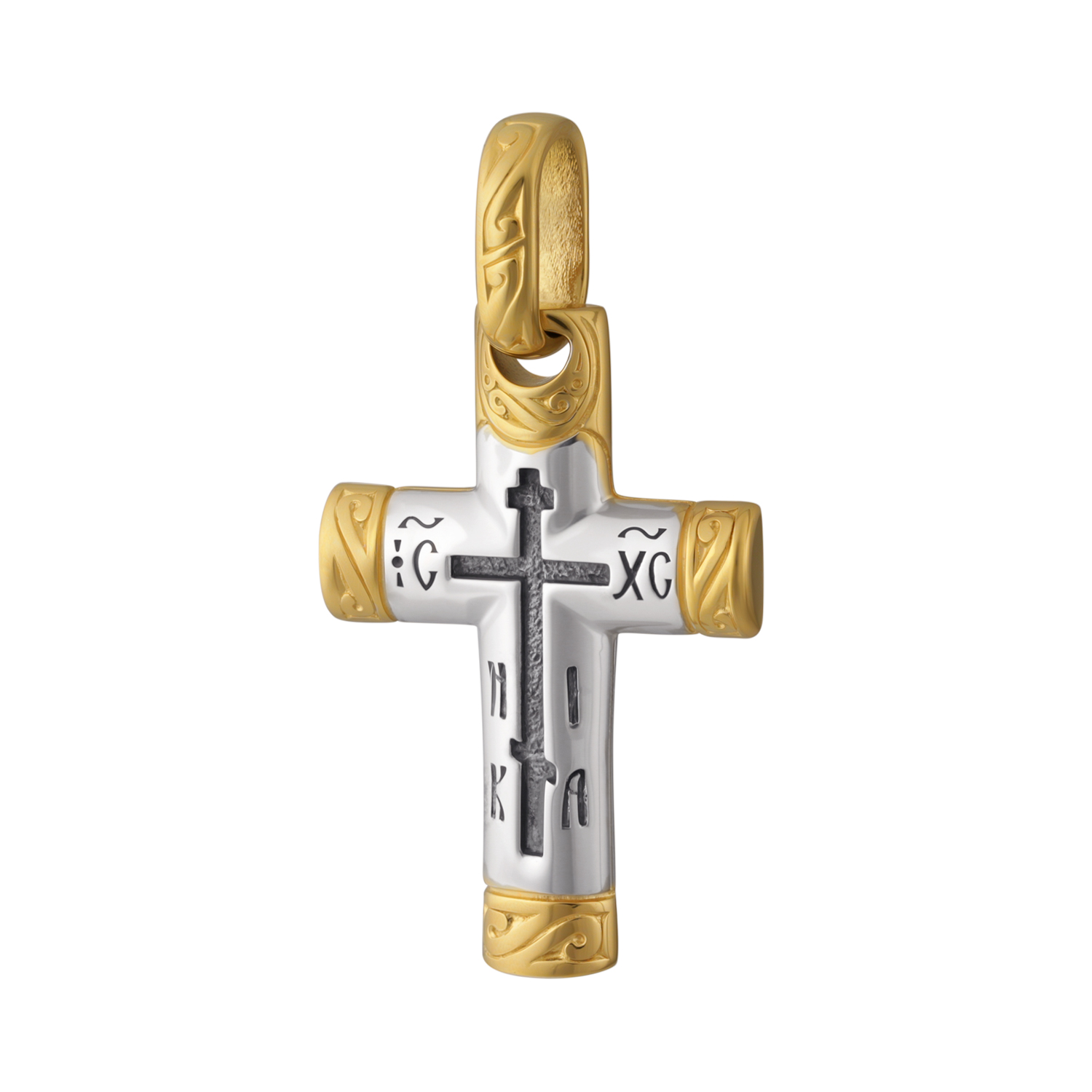 Этот крест выпускается в серебре и в серебре с позолотой. Подробности уточняйте, пожалуйста, у операторов при заказе.