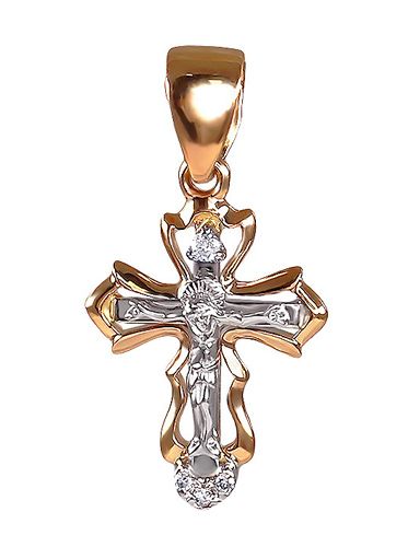 Крестик с Распятием выполнен из красного и белого золота и украшен 4 бриллиантами. Хорошо подойдёт для крещения ребенка. Соответствует православным канонам и освящен.
