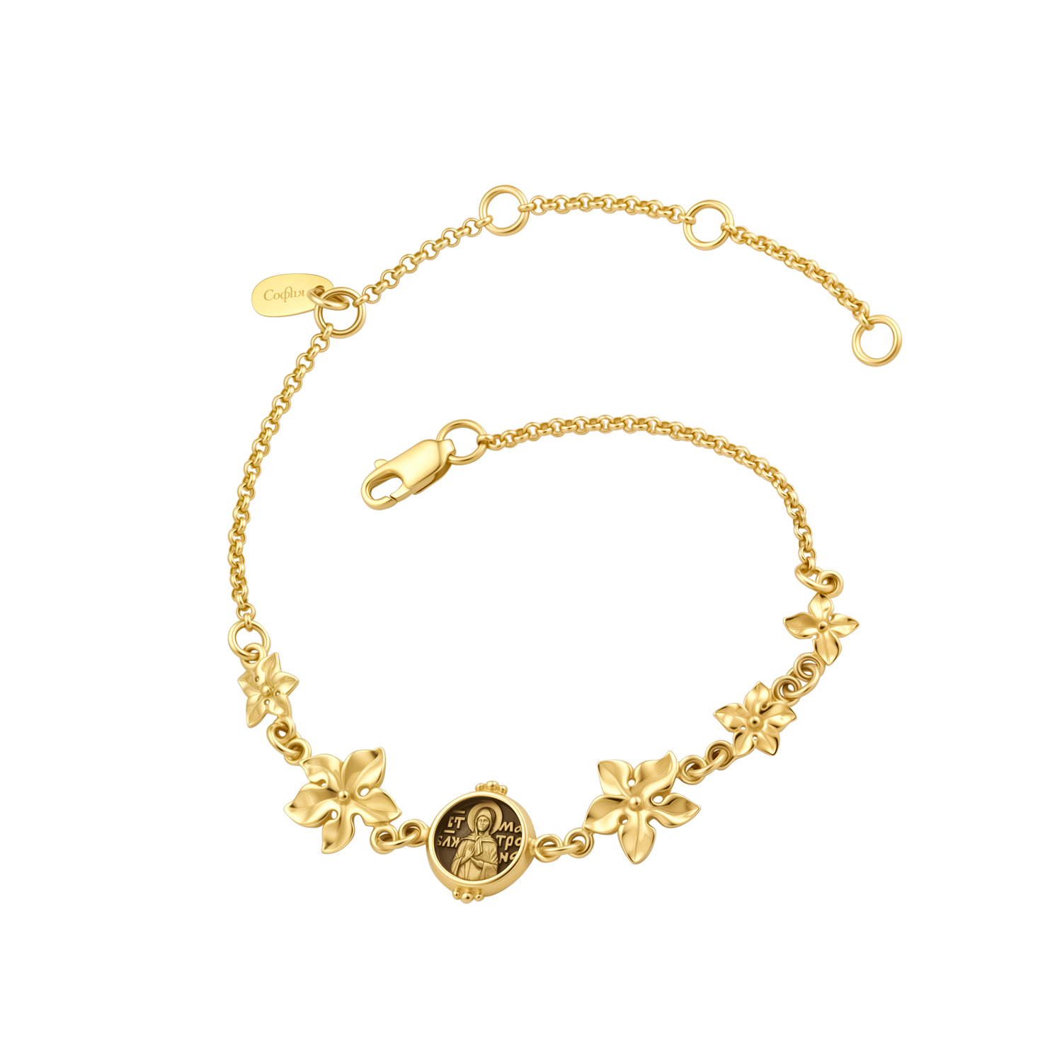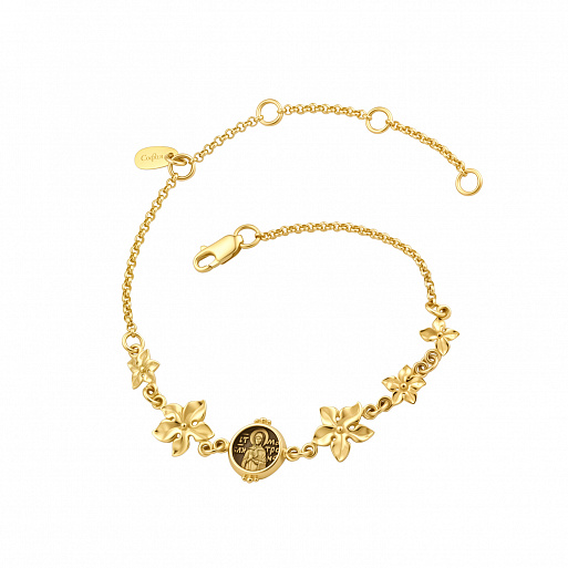 Золотой с чернением браслет состоит из звеньев-цветов, а на центральном элементе - образок святой Матроны Московской.