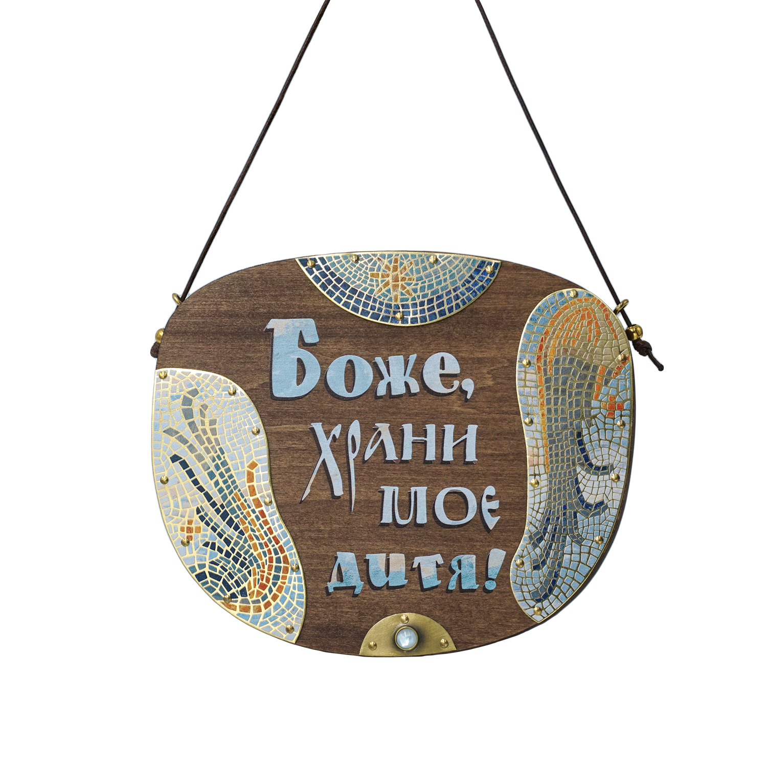 Эта табличка с молитвой о ребенке стилизована под раннехристианскую мозаику. На ней изображены Вифлеемская звезда – символ Рождества Христова – и ангельские крылья, олицетворяющие небесный мир и духовную защиту.